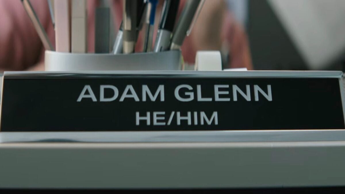 Although, to be fair, we haven’t seen the film yet. We don’t know the specific context. On the surface, it seems pretty obvious that the “he/him” pronouns on Adam’s name plate point to the fact that he’s “He-Man” in the movie. A truth that he feels deep within himself but cannot fully accept. (Wait until people start getting deeper into that.) However, maybe it’s not that way. Maybe Adam is some kind of crazy liberal who put them on his nameplate as an act of woke defiance against his conservative colleagues. But we seriously doubt it.