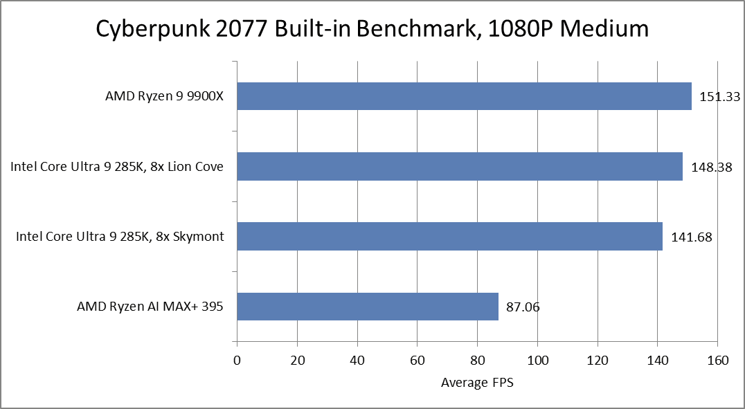 Cyberpunk 2077’s built-in benchmark is largely CPU bound when run at 1080P with medium settings and no upscaling. I used Intel’s Arc B580 on desktop systems, since it has vaguely similar compute power to Strix Halo’s iGPU. Results show a large gap between Strix Halo and AMD’s desktop platform, even though both use the same Zen 5 cores.