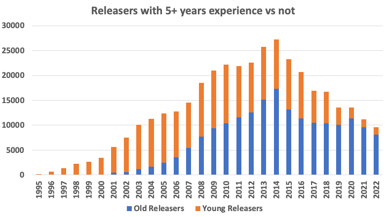 Either record, obviously. But it’s the best proxy I have. If anything, it’s higher: popularity increases slightly after 2022 compared to next year CPAN